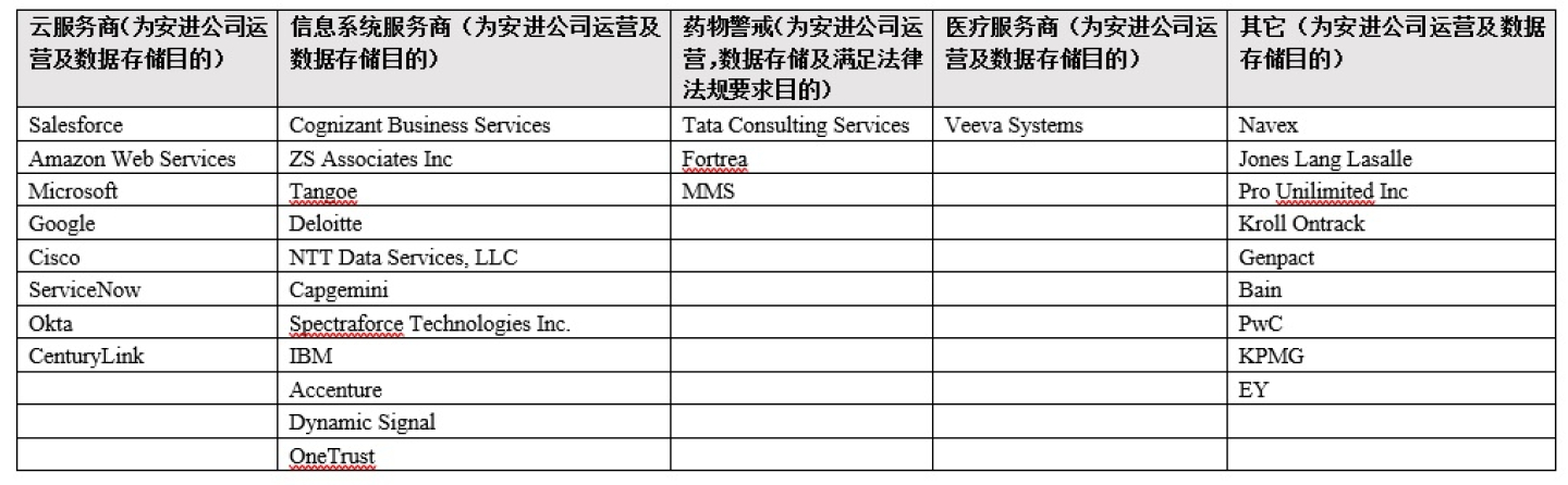 同时,由于安进使用境外母公司聘用的境外第三方公司提供的信息系统服务和与正常商业运营和管理相关的服务,该等境外第三方公司可能基于安进境外母公司的委托而受托处理相关信息,因此,您提交的个人信息也可能会被包括以下主体在内的境外第三方公司获取、存储、查询和处理。